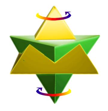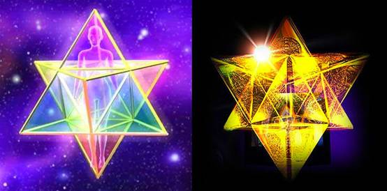 而我們要運作的幾何能量場是一個星四面體,它由兩個反向相嵌的四面體組成,你也可以想成兩個反向相嵌的金字塔,也可以把它看成一個三維立體的六芒星。當這個幾何能量場被重新激活並開始旋轉,它就被稱為一個梅爾卡巴。